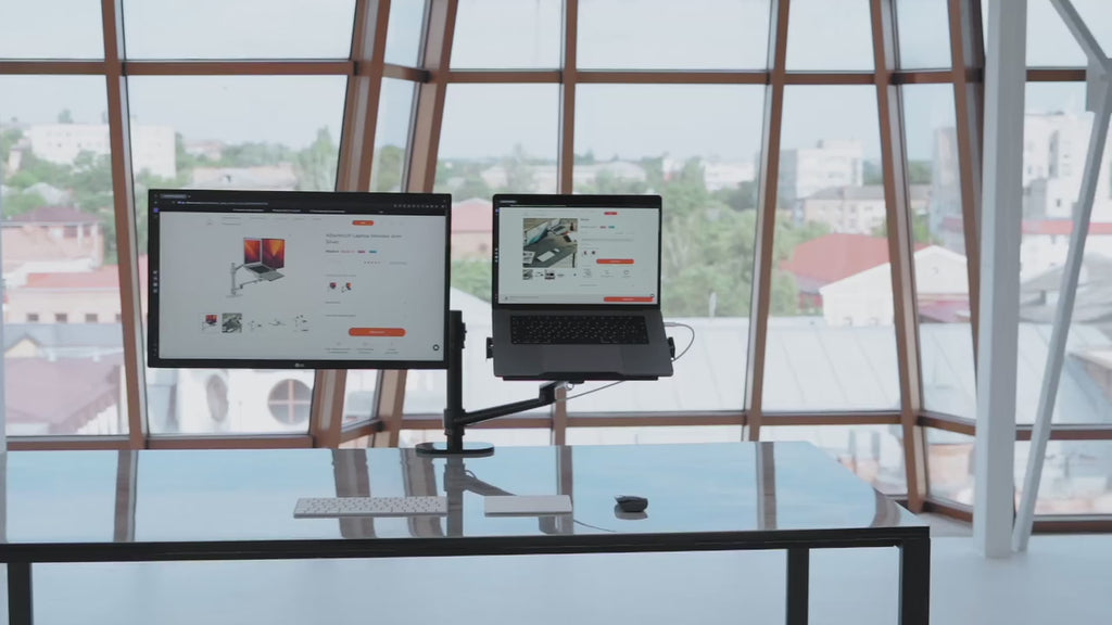 The Alberenz® laptop monitor arm (black) is a 2-in-1 solution that places your monitor (up to 32") and laptop at the ideal height and viewing angle—no extra stands required. Thanks to the intuitive adjustment system, you can tilt, swivel, and adjust height without tools. Perfect for hybrid workspaces, home offices, and multitasking professionals who want a neat, ergonomic setup.